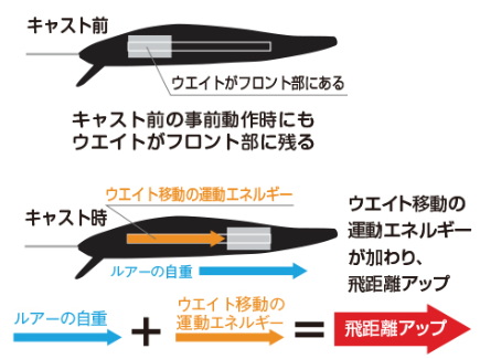 その結果、キャスト時にウエイトの運動エネルギーをルアーの初速に加えることができ、脅威的な飛距離を実現しました。