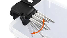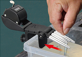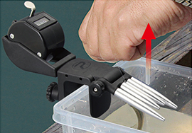 手を汚さずにワンタッチでワカサギを針から外せるカウンター付き針外し。