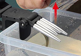 チモト部分を金属スリットに通し、そのまま上に引き上げるだけで簡単にワカサギが外せます。