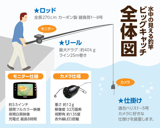水中カメラにより海の中を見ながら今にも魚が食いつく瞬間が分かり、しかも赤外線搭載により暗い夜でも使用可能!