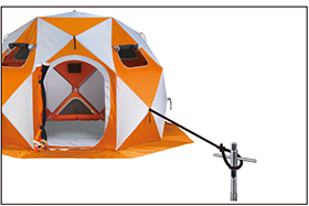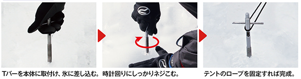 手動でセットする場合、Tバーに本体を取付け、氷に差し込み時計回りに回しながらセットして、テントのロープを固定して下さい。
