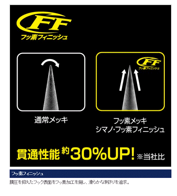 膜圧を抑えたフック表面をフッ素加工を施し、滑らかな刺さりを追求。