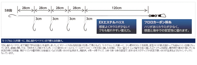 ビギナーにも多点鈎仕掛けを使って頂けるよう、「トラブルレス」を第一に、少し硬めのモトスを採用。