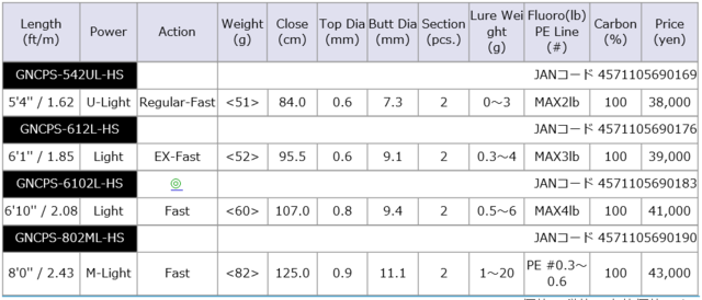 「軽さ=感度」という概念のもとブランクスからガイド、グリップパーツにいたるまですべてにおいて徹底的に軽量化を施し、最軽量モデルでは驚異の51g(予定値)を実現。