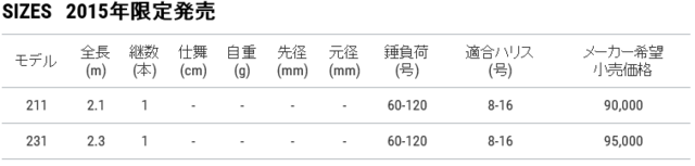 スモールベイトのアタリも逃さない鋭敏トップ違和感なく喰い込む卓越のしなやかさ大型青物&底物のパワーを受け止め、自在にコントロールする粘り強度とバットパワー終日手持ちでの軽量と操作性重視した211とベーシックレングス231の2モデルを昨年2014年に先行販売された241にくわえ2015年限定発売。