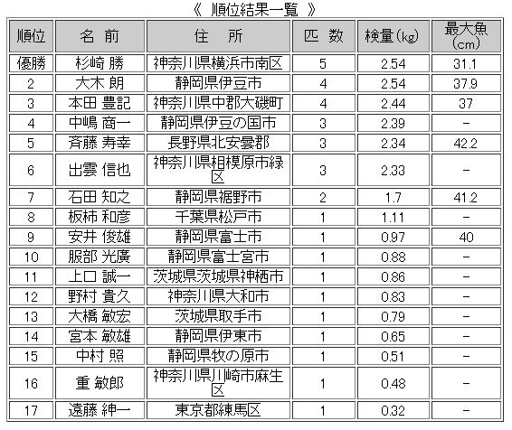 午後1:30試合終了。魚を持ち帰った選手は厳しいコンディションを反映し59人中17人。検量は中型魚が多く持ち込まれる中、37.9cmを頭に4匹を釣り上げた大木 朗選手と、ヤトリで5枚のリミットメイクを果たした杉崎 勝選手とが2.54kgの同重量となる大接戦となりましたが、大会規定の結果、匹数の多い杉崎選手の優勝となりました。3位は犬島で気を吐いていた本田選手。4匹の重量2.44kgで1位と2位の選手との差はわずか100g。数枚のバラしがあり5枚揃えられなかった事が悔やまれた結果となりました。