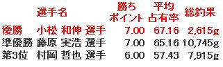 結果、優勝はともに2勝1分ながら、平均占有率で優った小松和伸選手が初の栄冠を手にし、準優勝は2年連続で藤原実浩選手となりました。