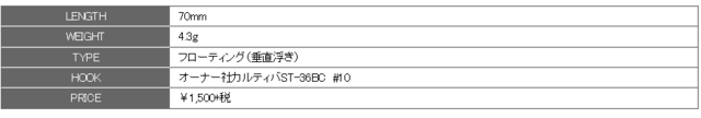 立ち浮き姿勢のペンシル「CB70PEN」は、メッキ・カマス・セイゴ・フッコなどをメインターゲットにした物で、ダイブや首振りは勿論、テンポの速いアクションにも対応する様に浮力を抑えた水絡みで、水面下に残るボディーがターゲットのバイトを誘発します。
