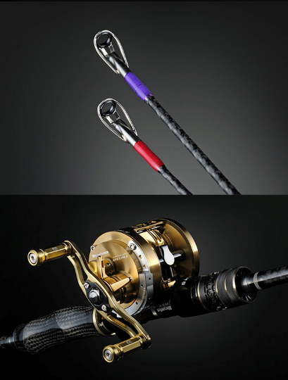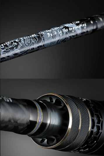 荷重を受けるガイドセクションに高密度コンポジットしたマイクロブレイデッドグラファイトファイバーが想定ターゲットの大きさを物語る、新開発「異軸多弾性ハイブリッドグラファイトコンポジット」ブランクスは、これまでのバスロッドのスペックを凌駕。