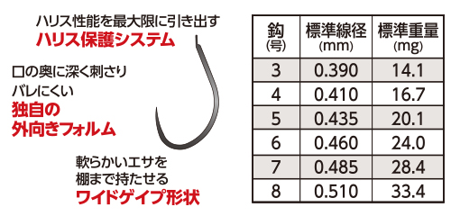 鈎の特長はハリス性能を最大限に引き出す『ハリス保護システム』や、口の奥に深く刺さりバレにくい『独自の外向きフォルム』。