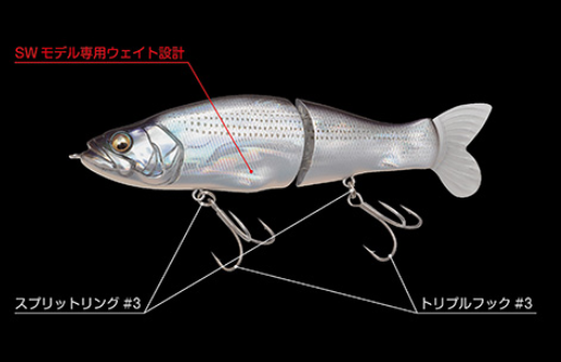 従来のシーバスルアーとは一線を画す、その存在感と極めてナチュラルなS字系スラロームアクションは、レギュラーサイズのプラグでは反応しにくい状況下において絶大な効果を発揮し、ビッグバイトを誘発します。