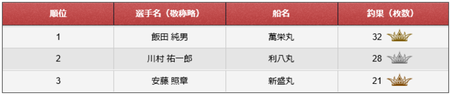 検量の結果、32匹を釣り上げられた、飯田選手が総合優勝を勝ち取られました。