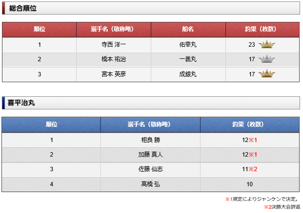 剱崎名物良型カワハギが姿を見せるもののなかなか全体に数が伸びない中、難敵を攻略し、見事12月2日に久比里で開催の決勝戦へ駒を進めたのは次の選手たちです。