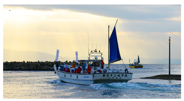 開国橋たもとの乗船場所へ移動の後、みのすけ丸、山下丸、やまてん丸の順番で各選手乗船していきます。