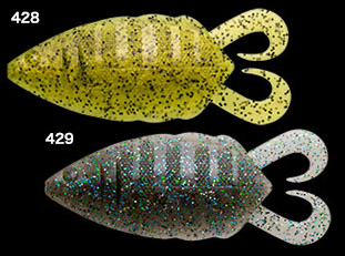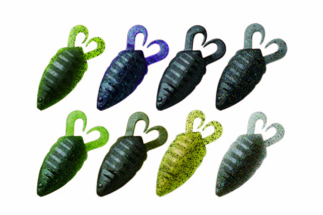 左右に膨らませたショートカーリーテールは、ノーシンカーでは動きづらく、スライドフォールを発生させ、一方シンカーがある場合はウエイトにより明滅的スイミングを生み出す計算し尽くされた厚みと長さ。