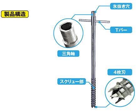 硬い氷にもしっかりささる4枚刃と、氷が抜ける中空構造により手動でも氷上にセット可能。