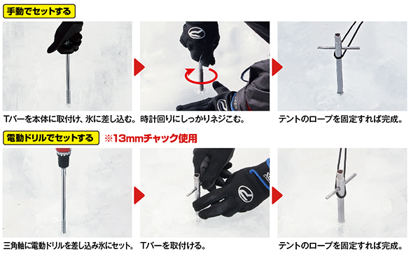 Tバーに本体を取付け、氷に差し込み時計回りに回しながらセットして、テントのロープを固定して下さい。