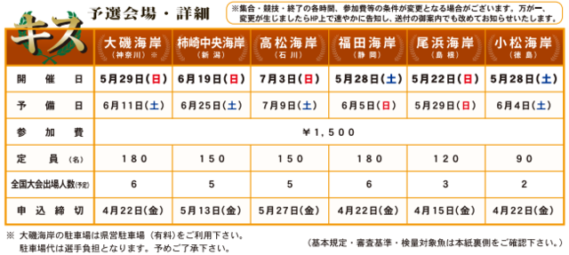 ・複数の予選会場への重複参加可能ですが、同日開催の福田海岸と小松海岸会場はどちらか1つを選択の上お申し込みください。両会場へのお申し込みは出来ません。