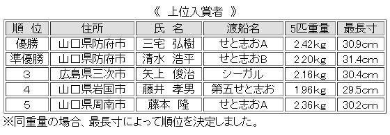 ※渡船は3隻使用。人数を均等割りし4グループに分け、グループの1位から順位を決定いたしました。1位、2位は決勝大会進出。3位、4位は補欠。