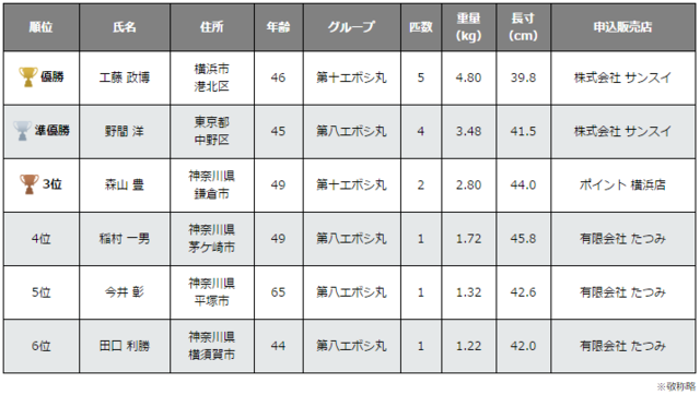 体長25cm以上のチヌ5匹までの総重量。同重量の場合は1匹長寸にて大きい方を上位とする。