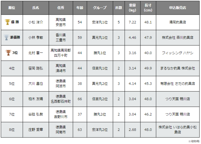 全選手中唯一良型ばかりを5匹揃えた高知県の小松洋介選手が優勝されました。