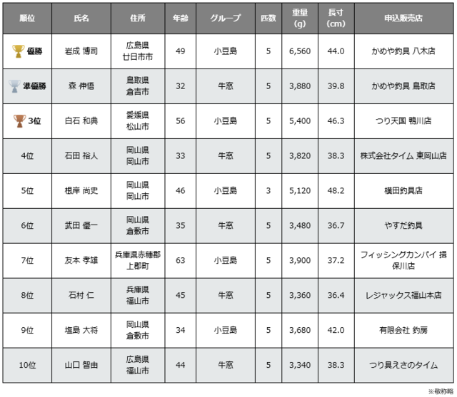 数の牛窓、型の小豆島という釣果の違いがありましたが、両グループとも僅差の接戦でした。