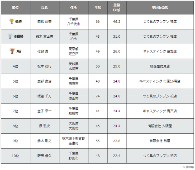 特定のパターンが存在せず、各選手手さぐり状態という状況の中で唯一1回戦、2回戦ともに20キロ超の釣果を出した國松政美選手が2位以降に圧倒的な差をつけ優勝されました。