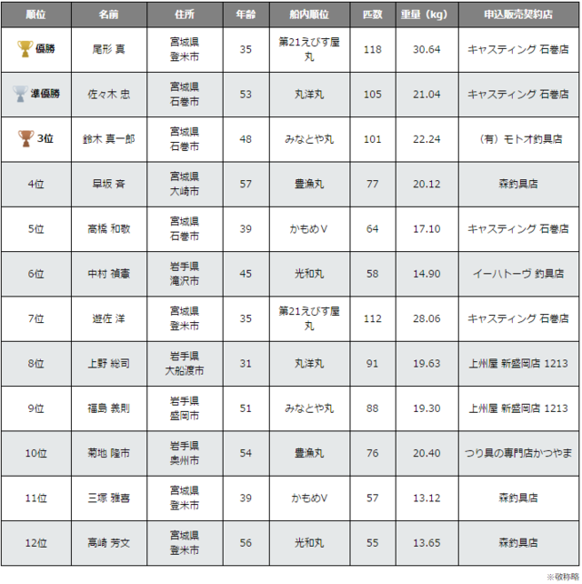 各船で釣果に違いが出たものの、尾形真選手が118匹の釣果で優勝されました。