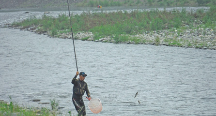 検量では込み2尾の選手が散見されたものの、一方では瀬脇や深瀬の岩、比較的流れの効いたトロ場など、緩い流れのポイントでは20cmを超える良型をはじめ、数、型ともにまずまずの釣果が上がっており、これからのシーズンに期待の持てる那珂川。
