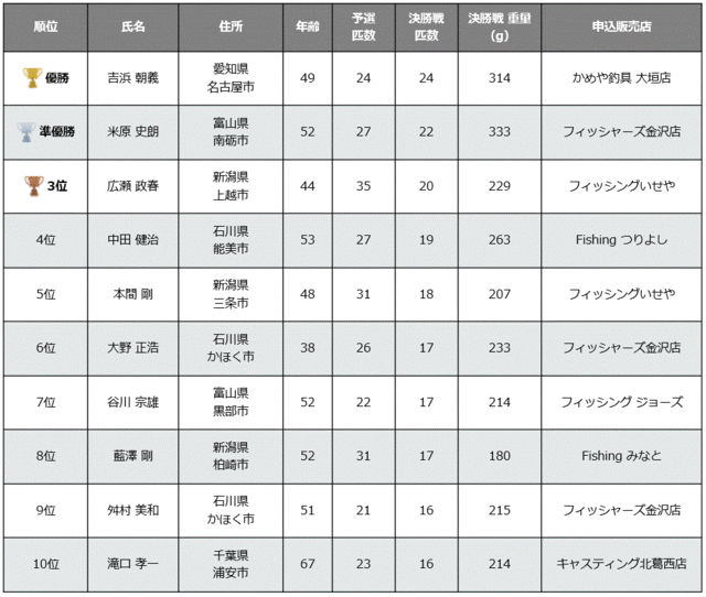 決勝で同匹数の場合は総重量の多い方を上位とする。
