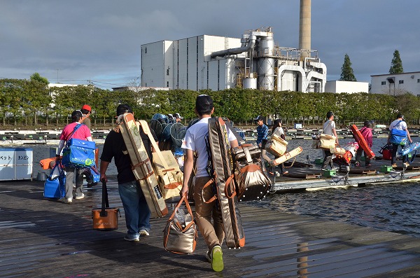 参加賞のオリジナルキャップ、Tシャツを受け取り、釣り座へと向かいます。