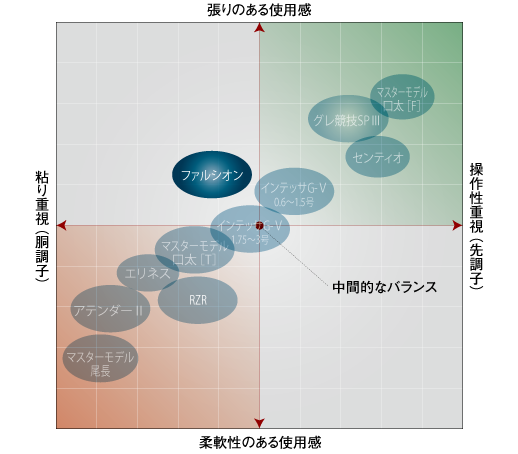 柔軟性のある竿は「胴調子」に属しているのですが、「がま磯 ファルシオンは張りがあるにも関わらず胴調子のポジションに属しています。