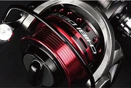 アルミマシンカットのスプールはナイロンライン2号150mが巻けるノーマルと0.6号150mが巻けるシャローの2タイプ。