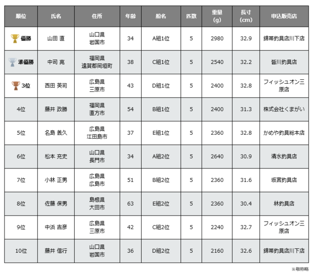 25cm以上のグレ5匹までの総重量。同重量の場合は最大1匹長寸の大きい方を上位とする。