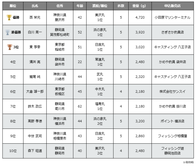 1位~7位については各渡船のトップの中で審査。