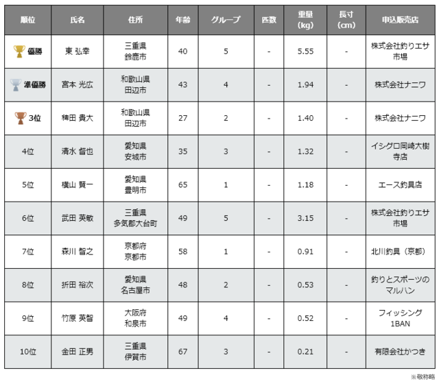 全体的に釣果が振るわない中、三重県の東弘幸選手が5kgオーバーの好成績で優勝を決めました。