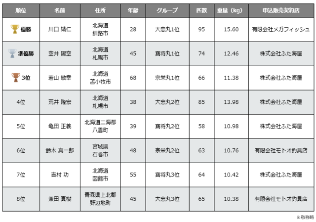 各船ともに好釣果で、川口靖仁選手が95匹(15.60kg)の釣果で優勝されました。