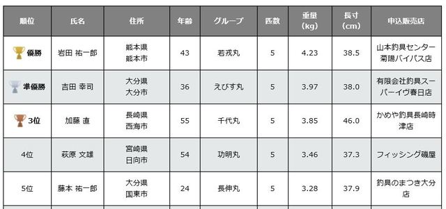 同重量の場合は最大魚1匹長寸により決定。選抜方法 船内順位制。