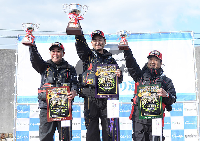 秋田・男鹿、福井・若狭大島、大分・米水津など全国10会場の予選勝ち抜きにシード、がまかつ推薦を含む48選手が参加、釣った30cm以上のグレの総重量を競った。