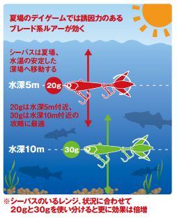 シーバスを誘き寄せるブレードの回転力&ベイトライクなボディはそのままに5m付近のターゲットに効果を発揮します。