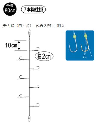 小物釣りに定評のある形状をしたチカ鈎の白・金を採用。アピール力を高める為に、夜光留と夜光留ファイバーを使用しました。