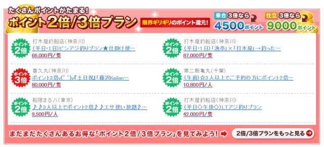 乗合プランでも、3人や5人のグループで予約する事で、通常1,500ptの釣割ポイントがなんとっっ、3倍の4,500pt貰えちゃうというお得な内容!